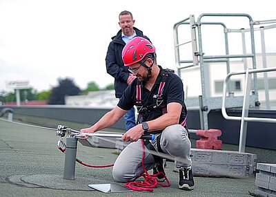 Die Arbeit auf der Baustelle sicherer machen ist auch bei ABS Safety höchstes Gebot. Das Unternehmen, welches 2003 gegründet wurde, gehört eigenen Angaben zufolge zu den Vorreitern in der Entwicklung, Fertigung, Planung und Installation von innovativen Systemen zur professionellen Absturzsicherung. Das Familienunternehmen produziert mit über 140 Mitarbeitern Anschlageinrichtungen, Seilsicherungssysteme und Schutzgeländer, die nach den neuesten Vorschriften und modernen Fertigungstechniken überwiegend am Firmensitz in Kevelaer hergestellt werden. Hier finden sich neben den Planungsbüros und der Entwicklungsabteilung mit eigenem Hightech-Fallturm auch riesige Lagerkapazitäten und eine Produktionsfläche von 2 000 m².