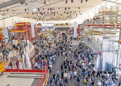 Ein weiteres Produktmerkmal beim Easy-Stiel ist der integrierte Gerüstknoten. Dieser macht das »Peri Up«-Fassadengerüst äußerst flexibel, auch für komplexe Fassadeneinrüstungen. In Siegsdorf konnten damit Rundbehälter und Gebäudevorsprünge berücksichtigt, also eine räumliche Anpassung mit Systembauteilen realisiert werden. Das einfache Einhängen von Horizontalriegeln in den Gerüstknoten ersparte aufwendige Rohr-Kupplungsmontagen bei den außen- und innenseitigen Verbreiterungen und Anbauten. Beispielsweise ließen sich außen liegende Treppenaufgänge direkt, also nahezu kupplungsfrei anschließen. Auch ein nahtloser Übergang von Easy- auf Flex-Bauteile, beispielsweise für die Schutzdachausbildung im Zugangsbereich zur Halle und als vorgelagerte Absetzbühne, war dadurch möglich. Das ist nicht nur montagefreundlich, dadurch ließen sich auch die Belagflächen weitestgehend stolperfrei ausbilden – für sicheres Arbeiten bei der späteren Gerüstnutzung.