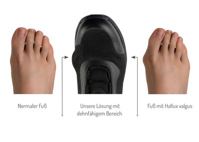 Die Lösungspalette für Hallux-valgus-Geplagte komplettiert das Unisex-Modell »Sid«. Es kombiniert den Strickschaft mit dehnfähigem Hallux-Bereich mit besonders leichter Durchtritthemmung, einer dämpfenden Zwischensohle und einem »Boa-Fit«-Drehverschluss für einhändiges Öffnen und Schließen und zur optimalen Justierung der Passform. Diese Ausstattungsmerkmale helfen, Druckstellen zu vermeiden, die Füße zu schonen, das Gangbild zu verbessern sowie Knie und Rücken zu entlasten.