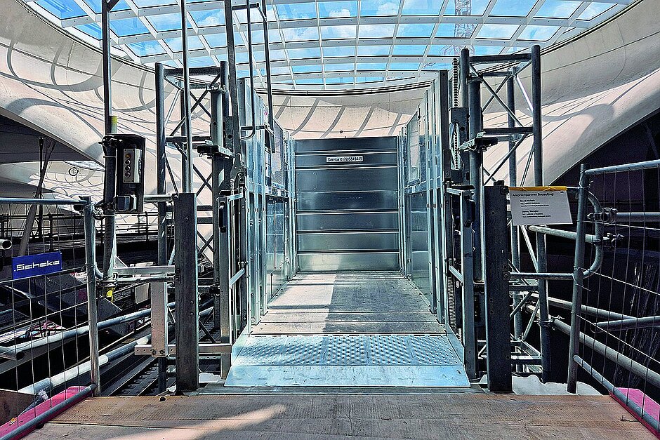 Die entscheidende Anpassung betraf die Kabinengeometrie. Statt der üblichen Kabinenbreite von 2,90 m wurde für »Stuttgart 21« eine schmalere Kabine mit Innenmaßen von 1,40 m Breite und 2,90 m Tiefe entworfen. Diese Modifikation ermöglichte den Einbau in den runden Aufzugsschacht, ohne die Funktionalität einzuschränken. Dabei konnte der Grundrahmen einschließlich der kompletten Steuerungseinheit in der Unterfahrt integriert werden, während der Ausstieg bündig mit dem Bahnsteig abschließt. Jede der beiden Transportbühnen verfügt über eine hohe Tragfähigkeit von bis zu 4 t und ist sowohl für den Material- als auch den Personentransport zugelassen. Der Aufzug lässt sich wahlweise von den Ladestellen aus rufen oder direkt in der Kabine bedienen. Mit einer Förderhöhe von rund 10 m und zwei Haltestellen – am Verteilersteg und am Bahnsteig – gewährleisten die Anlagen eine kontinuierliche Versorgung der Bahnsteige während des Ausbaus.