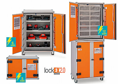 Die zertifizierten Ladeschränke »8/5« und »8/10« sind in der Lage, eventuelle Druckspitzen abzubauen, die durch Verpuffung austretender Brandgase im Schrank entstehen. Ein patentrechtlich geschützter Entlastungsmechanismus bläst den Überdruck ab, ohne dass Flammen oder gar brennende Bruchstücke die Umgebung gefährden. Der Schrank bleibt funktionsfähig und sicher. So lassen sich auf einer oder mehreren Ebenen Li-Ionen-Batterien über ein- oder drei-phasigen Netzanschluss sicher laden und lagern. Schränke mit nicht ausreichender Druckentlastung können in solchen Fällen versagen und zu Umgebungsbränden führen. Bestehende Schränke sollten daher auf den neuesten Stand der Technik bei der Druckentlastung geprüft und eventuell nachgerüstet werden, um wirklich sicher zu sein.