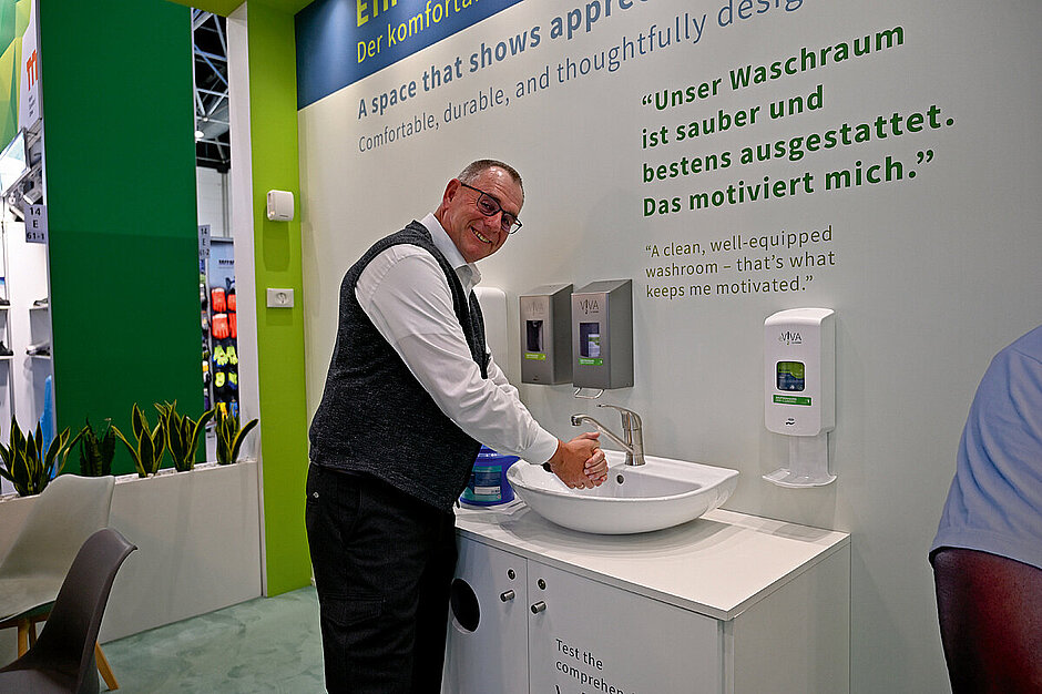 Herwe-Vertriebsleiter Rolf Hauber erklärt: »Bei beiden Produkten legen wir auch Wert auf den wirtschaftlichen Aspekt. Die Tücher können mehrfach genutzt werden und die Reinigungslösung ist äußerst sparsam im Verbrauch.« Die »Herwe Orange Fresh Abrasive Wipes« gibt es im praktischen Spendereimer mit 100 Stück Inhalt. »Sedasan BlueMaX« bietet das Unternehmen in zahlreichen Gebinde-Varianten an, u. a. in Flaschen für das bewährte »Viva«-Spender-System.