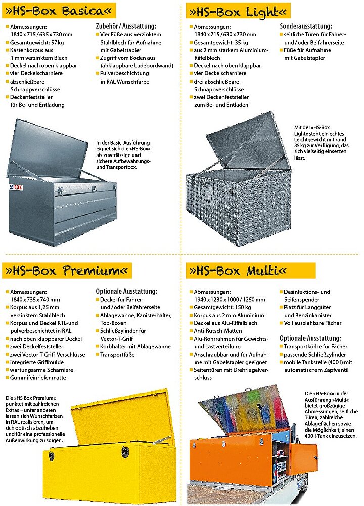 Grundsätzlich lassen sich alle Box-Ausführungen von HS-Schoch individuell gestalten – auch Spezialstaukästen oder seitliche Türen für eine vereinfachte Entnahme sind möglich. Gleiches gilt laut HS-Schoch für entsprechende Füße zur Gabelstapler- oder Radlader-Beladung. »Entstanden ist die Idee aus der Erfahrung heraus: Wir arbeiten eng mit Anwendern zusammen und tauschen uns regelmäßig aus. Auf diese Weise können wir die Innenausstattung der Boxen praxistauglich konstruieren und uns auf veränderte Anforderungen einstellen«, stellt Dietmar Beuther klar.