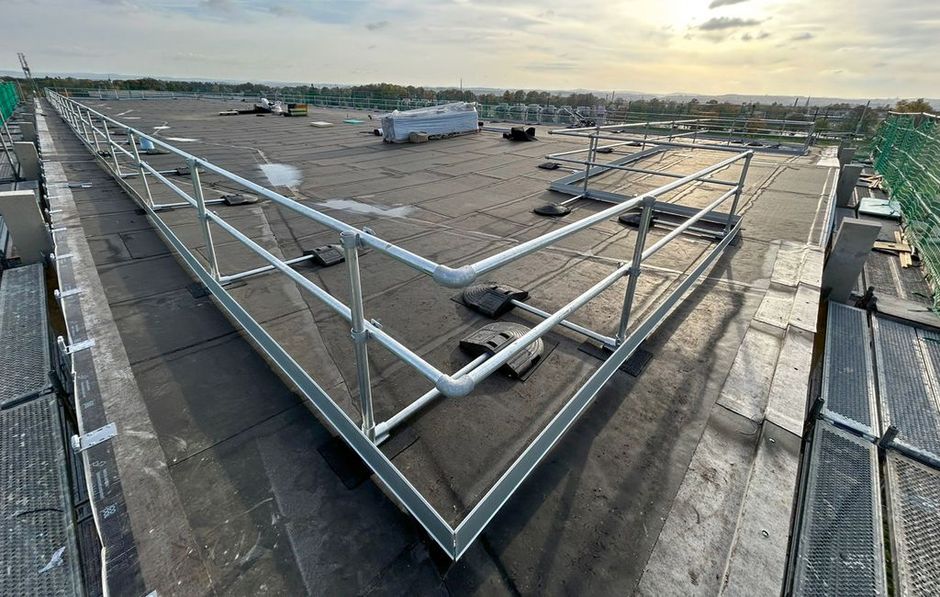 Das System besteht aus robusten, feuerverzinkten Stahl- oder Aluminiumrohren, verbunden durch langlebige Rohrverbinder. Ballastierte Gewichte halten das Geländer sicher in Position – ganz ohne Bohren, Schweißen oder Eingriff in die Dachabdichtung. So bleibt die Dachhaut intakt, Undichtigkeiten werden vermieden und die Montagezeit minimiert. Dank seines modularen Aufbaus kann »Kee Guard« außerdem an nahezu jede Dachform angepasst werden – ob mit oder ohne Attika, gerade oder geneigt. Auch Sonderlösungen, etwa für enge Dachränder oder Bereiche mit eingeschränktem Platzangebot, sind problemlos realisierbar.