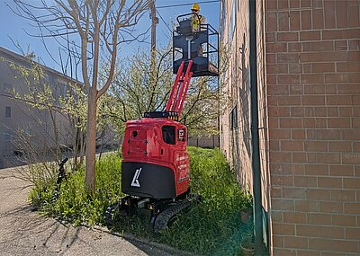 Mit ihrer kompakten Bauweise, dem drehbaren Arbeitskorb und einer hohen Reichweite ist die Bühne ideal für anspruchsvolle Einsätze – sei es in schwer zugänglichem Gelände, engen Innenhöfen oder unter Dachvorsprüngen. Die Bühne erreicht eine Arbeitshöhe von bis zu 17,60 m und bietet eine seitliche Reichweite von 9,60 m, wodurch effizientes Arbeiten an Fassaden und Überdachungen möglich ist, ohne die Position ständig verändern zu müssen. Dank einer Korblast von bis zu 230 Kilogramm finden zwei Personen samt Werkzeug problemlos Platz im Korb. Der 360-Grad drehbare Oberwagen sorgt zudem auch bei beengten Platzverhältnissen für maximale Flexibilität.