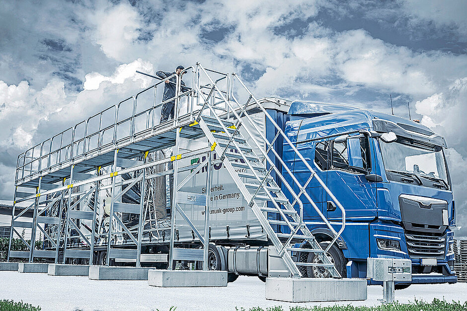 Neu im Sortiment ist die bereits komplett vorkonfigurierte Enteisungsanlage mit einer Gesamtplattformlänge von 15,96 m und einer Plattformbreite von 850 mm. Mit der Plattformhöhe von 3 m und einem 1,1 m hohem Geländer bietet sie die idealen Arbeitsbedingungen für die Enteisung oder auch die Wartung und Reparatur von Lkw und Bussen. Auch mobil bietet die Munk Günzburger Steigtechnik die Enteisung an. Die mobile Variante des Enteisungsgerüsts ist über vier Lenkrollen beweglich und lässt sich ganz ohne Werkzeug schnell und sicher aufbauen. Die Montage erfolgt über Steckverbindungen und selbstverschließende Verschlussklauen. Unter dem Motto »Enteisung to go« können die Rollgerüste zum Transport auch in einem Gitterrollwagen verstaut und auf einen Lkw geladen werden, sodass sie besonders flexibel und standortunabhängig eingesetzt werden können.