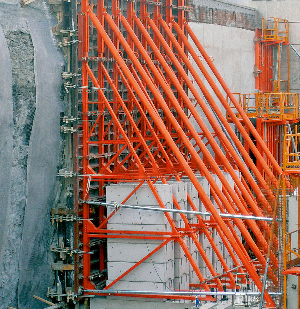 Die Paschal-Stützböcke sind systemneutral und damit mit allen gängigen Schalsystemen einsetzbar. Ergänzt wird das Sortiment durch passende Ankersysteme in den gängigen Durchmessern, die für eine exakte und sichere Kraftableitung sorgen. Die zugehörigen Bemessungstabellen mit allen relevanten Kräften in Abhängigkeit des Frischbetondrucks werden vom Hersteller bereitgestellt. An den Schalungselementen lassen sich außerdem Arbeitsbühnen mit integrierten Aufstiegen und Seitenschutz montieren. So ist ein sicheres Arbeiten auf allen Höhen gewährleistet.