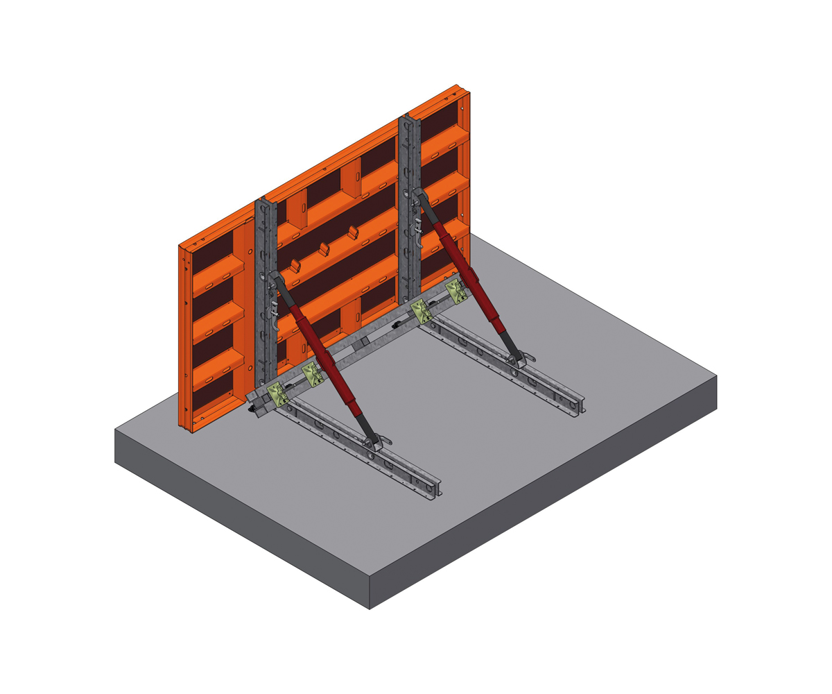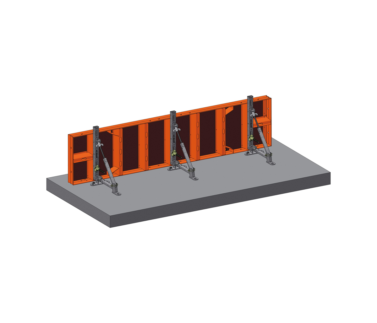Die Verbindung von Stützbock und Schalungselementen über Systemteile sorgt für eine stabile Einheit. Diese kann vormontiert werden und lässt sich taktweise als Ganzes umsetzen. Integrierte Spindeln im Stützbock ermöglichen eine exakte Ausrichtung der Schalung.