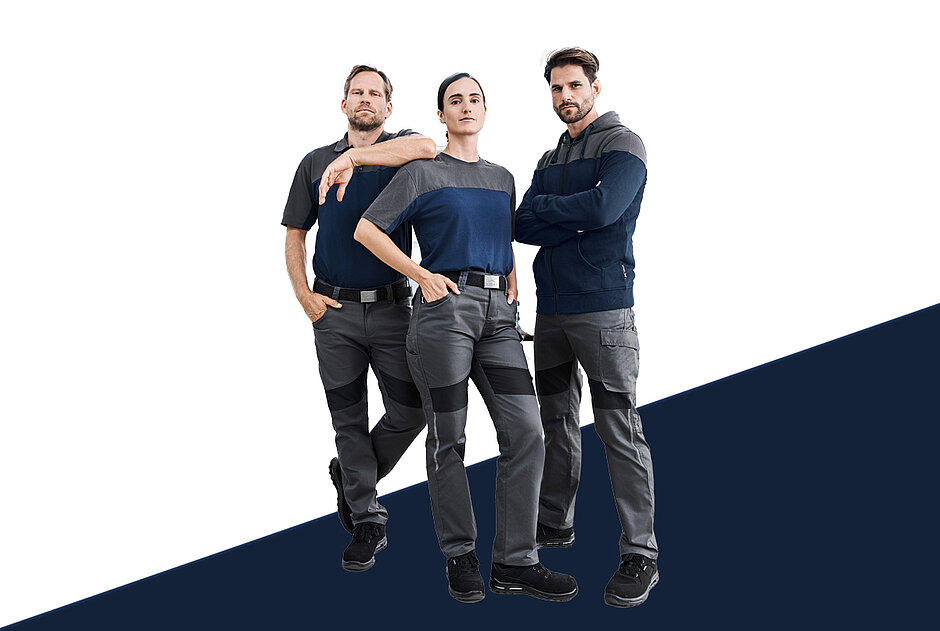 Die »Reforce«-Kollektion umfasst Arbeitsjacke, Damen- und Herrenbundhose, Latzhose und Shorts in den vier Farbstellungen Dunkelblau-Eisblau, Dunkelblau-Dunkelgrau, Dunkelgrau-Schwarz und Schwarz-Dunkelgrau. Neben dem durchgängig eingesetzten Zwei-Wege-Stretchmaterial unterstützt die ergonomische Schnittführung von Jacken und Hosen mit zusätzlichen Bewegungszonen die natürlichen Bewegungsabläufe und bietet extra Spielraum bei Arbeiten in der Hocke oder über Kopf. Elastische Strickeinsätze an den Ärmelbündchen und am Hosenbund erlauben es zudem, auf Druckknöpfe, Klett und Gummizüge zu verzichten, was ein Mehr an Komfort, Beweglichkeit und auch Haltbarkeit bedeutet. Als Kombinationsmöglichkeiten stehen T-Shirt, Polo, Sweatshirt und Kapuzen-Sweatjacke in der gleichen Optik zur Verfügung. Für Außeneinsätze bei kühleren Temperaturen stellt Kübler die Hybrid-Softshelljacke und die Hybridweste mit melierter Strick- und symmetrischer Steppoptik in den entsprechenden Farben bereit.