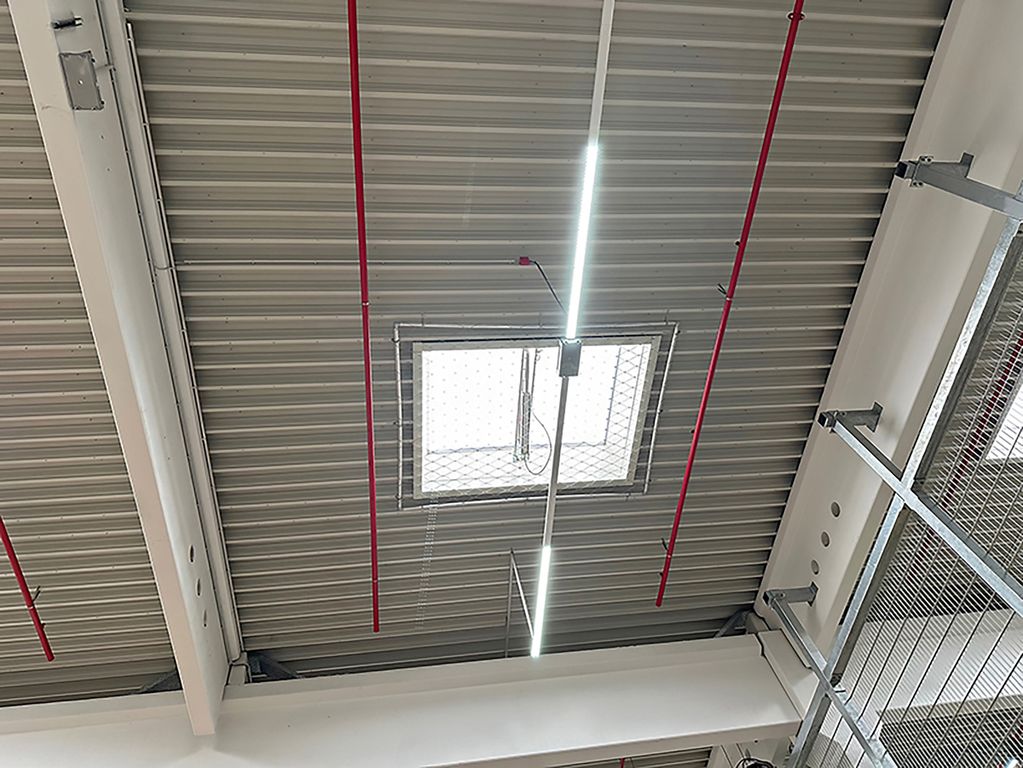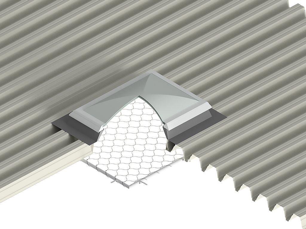 Die GS-BAU-18-konforme »Dome Light Protection« wird von Lux-top vormontiert geliefert und kann einfach mit einer Hebebühne von innen angebracht werden. So ist die Montage schnell und unkompliziert vollbracht. Das Sicherungsnetz ist in Rahmengrößen von 1,0 x 1,0 m bis 3,0 x 3,0 m erhältlich. Bei langen Lichtbändern ist es möglich, mehrere Rahmen miteinander zu verbinden und so eine modulare durchgängige Durchsturzsicherung zu gewährleisten. Dank der Luftdurchlässigkeit des Edelstahlnetzes von etwa 95 Prozent bleibt die Belüftung der Öffnungen erhalten.
