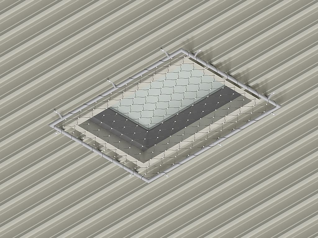Die »DLP« besteht aus einem Aluminiumrahmen und einem Edelstahlnetz und kann nachträglich an allen tragfähigen Untergründen an der Lichtkuppel oder dem Lichtband installiert werden. Die Durchsturzsicherung wird von unten an der Dachkonstruktion angebracht, ohne dass die Lichtkuppel für die Montage geöffnet werden muss. Damit werden Undichtigkeiten verhindert, und der Öffnungsmechanismus muss nicht ausgespart werden. Ein weiterer Vorteil: »Dadurch, dass der Rahmen unterhalb der Dachkonstruktion hängt und beliebig überlappen kann, ist kein millimetergenaues, zeitintensives Aufmaß notwendig und eine aufwändige Eindichtung kann gespart werden«, erklärt Geschäftsführer Christian Steinmetz.